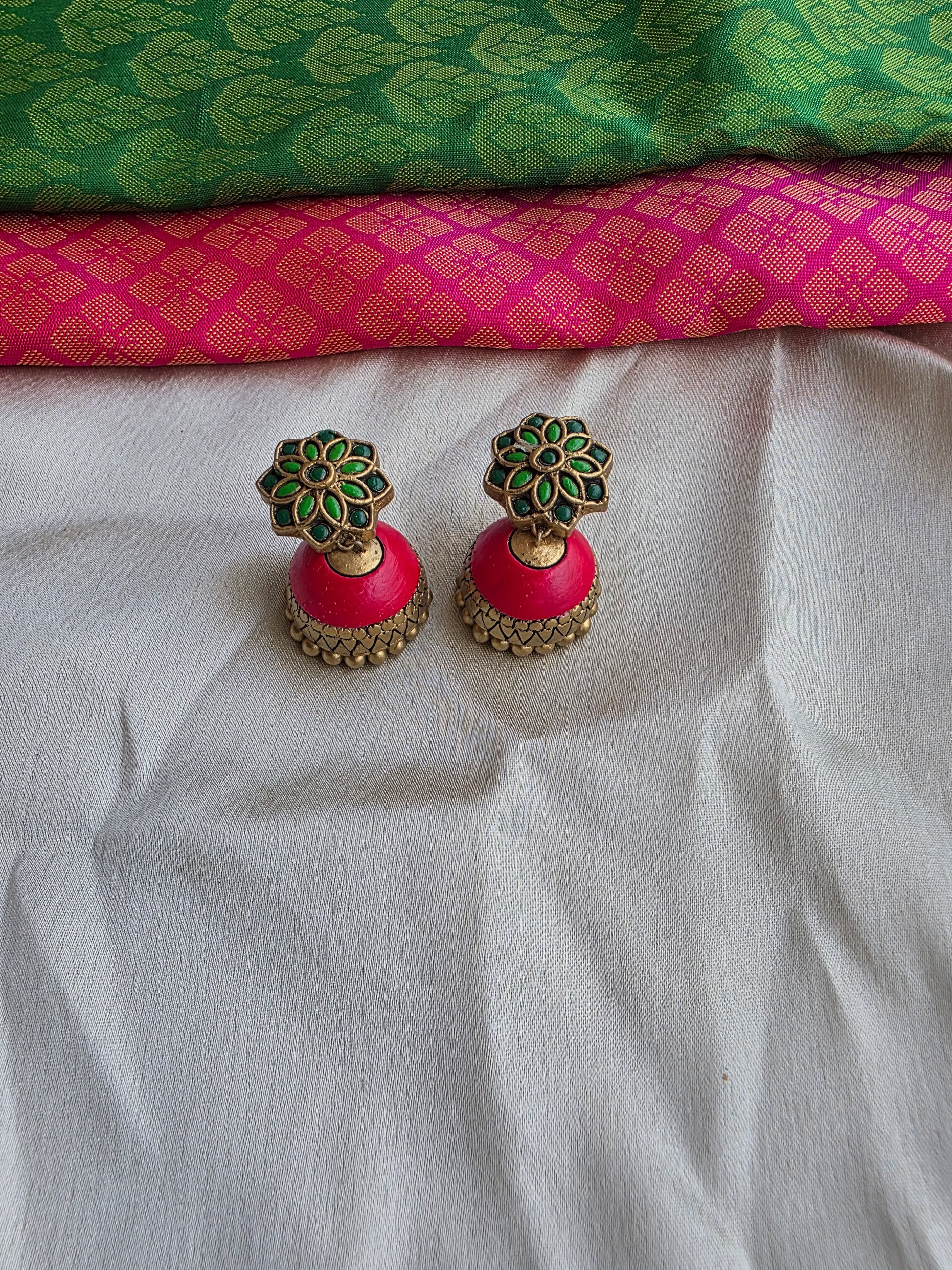 The rich red reflects strength and celebration, the vibrant green signifies growth and harmony, while the antique gold finish adds a timeless temple elegance. Each floral motif is carefully handcrafted, shaped, baked, and hand-painted with love — carrying the warmth of earth and the story of skilled hands.