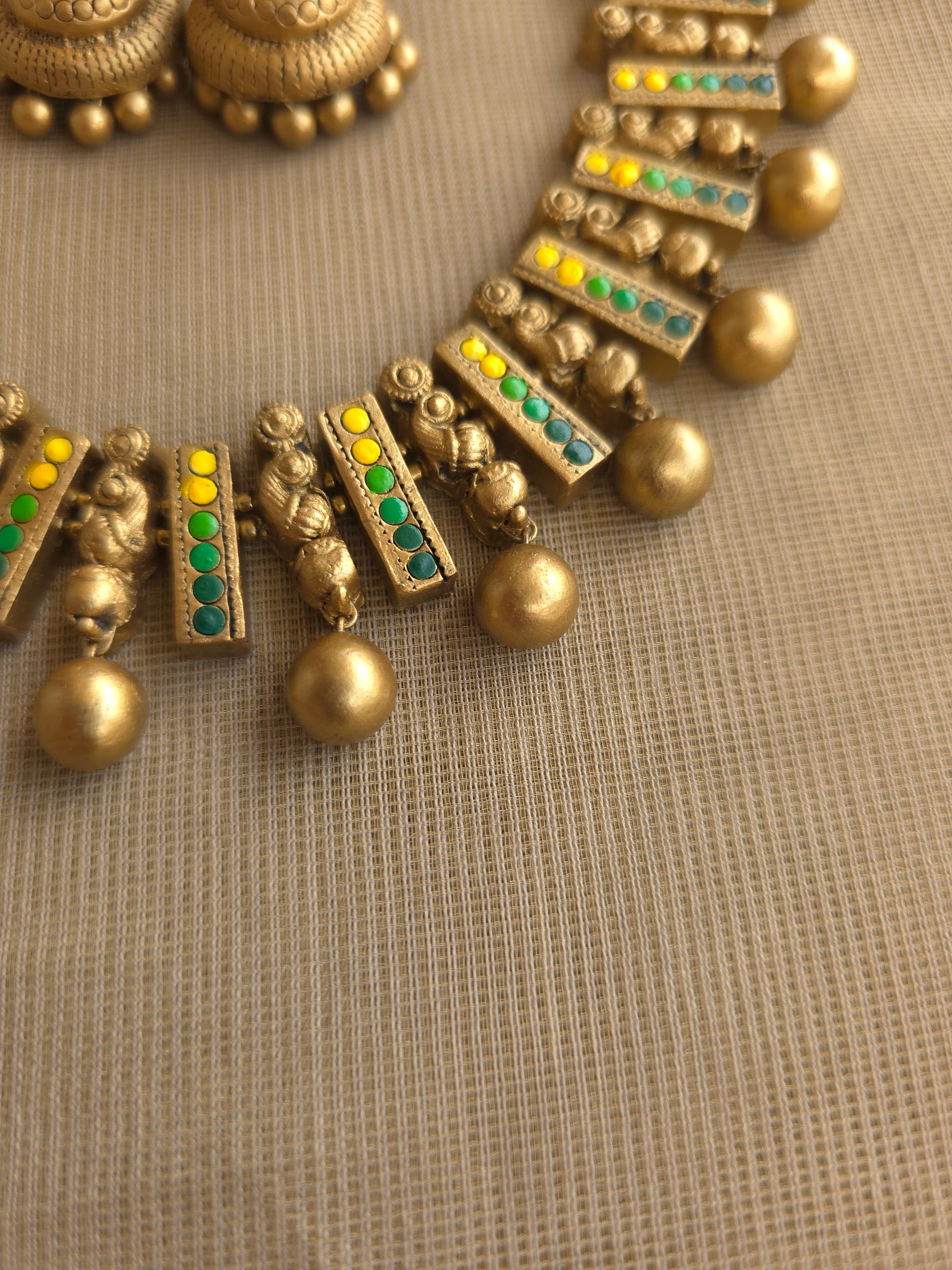 The vibrant yellow radiates joy and positivity, while the deep green brings balance and tradition together in perfect harmony. Lightweight yet statement-making, this necklace beautifully complements silk sarees, festive wear, and even contemporary outfits.